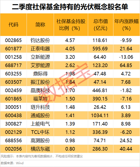 截至今年第二季度末,有14只光伏概念股获得社保基金持仓,钧达股份、正泰电器、立新能源的持股比例居前,均超3%。