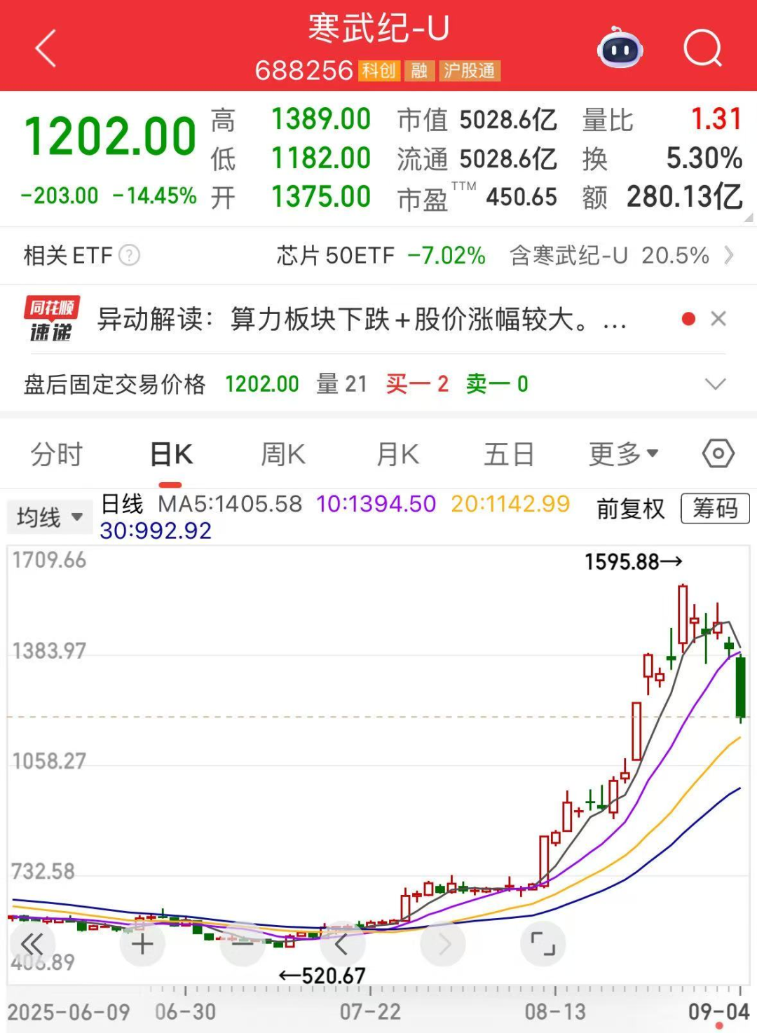寒武纪-U(688256)今日一度跌超15%,收盘报1202元/股,市值为5028.6亿元,与前一日相比,该股市值蒸发近850亿元。自9月1日以来,寒武纪-U股价已累计下跌19.46%。