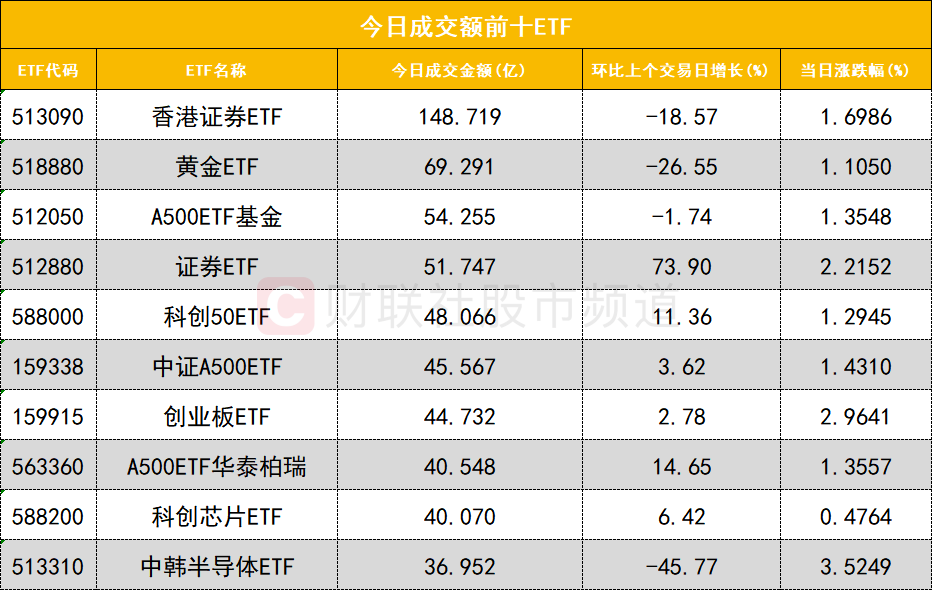 从成交额前十的ETF来看,香港证券ETF(513090)成交额位居首位,黄金ETF(518880)成交额位居次席。