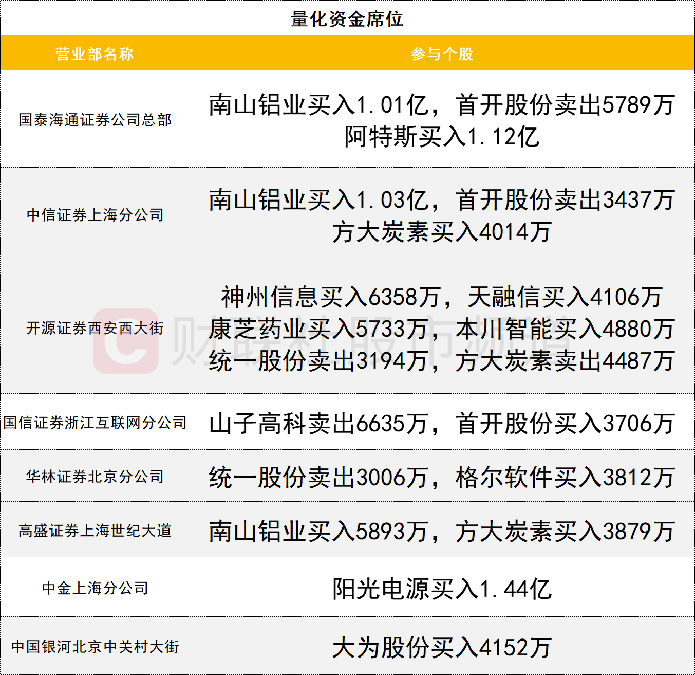 量化资金活跃度较高,阳光电源获一家量化席位(中金公司上海分公司)买入1.44亿。南山铝业获三家量化席位合计买入2.6亿。