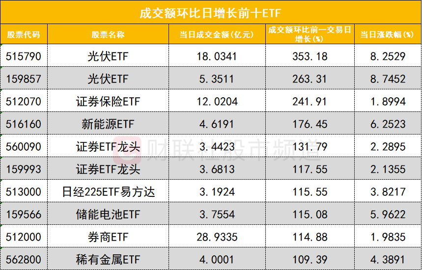 从成交额环比增长前十的ETF来看,光伏ETF(515790)成交额环比增长353%位居首位;光伏ETF(159857)成交额环比增长263%位居次席。