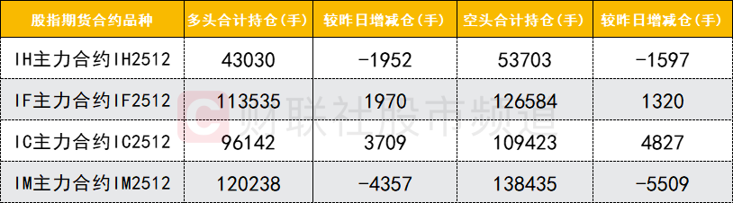 四大期指主力合约中,IH、IM合约多空双方均减仓,IM合约空头减仓数量较多。