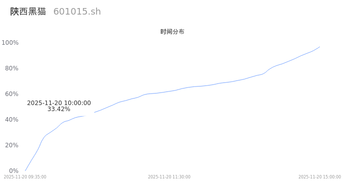 601015陕西黑猫2025年11月20日成交46.49万手,成交金额1.96亿,相较昨日缩量19.54万手,换手率2.28%,成交清淡。