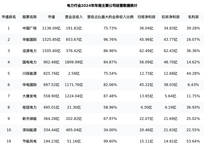 节能风电最新报告期数据为年报,下表汇总了电力行业内市值靠前的公司年报主要经营数据