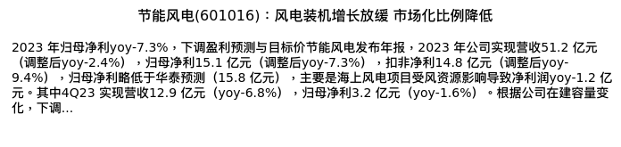 值得注意的是:2024年04月华泰证券的王玮嘉/黄波/李雅琳/胡知分析师,首次发布关于节能风电的研究报告,标题为:节能风电(601016):风电装机增长放缓 市场化比例降低。