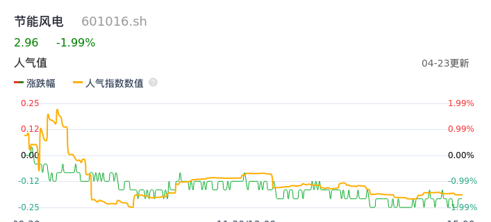 04月23日,节能风电收报2.96,股价涨幅-1.99%,成交金额1.77亿元,换手率1.00%。