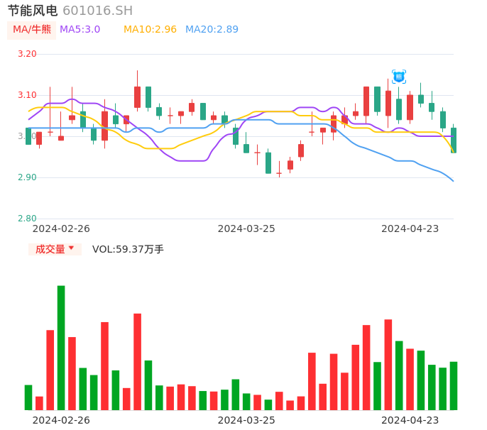 04月23日,节能风电收报2.96,股价涨幅-1.99%,成交金额1.77亿元,换手率1.00%。