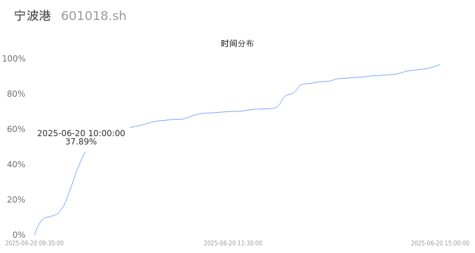 601018宁波港2025年06月20日成交38.52万手,成交金额1.39亿,相较昨日放量385手,换手率0.24%,成交清淡。