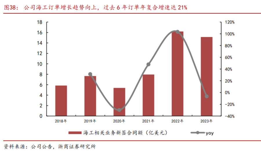 公司海工订单增长趋势向上,过去6年订单年复合增速达21%。据公司年报统计,公司海工装备订单从2018年的5.83亿美元增长至2023年的15.14亿美元,2018-2023年订单金额CAGR=21%。保持了稳中有进的发展态势。