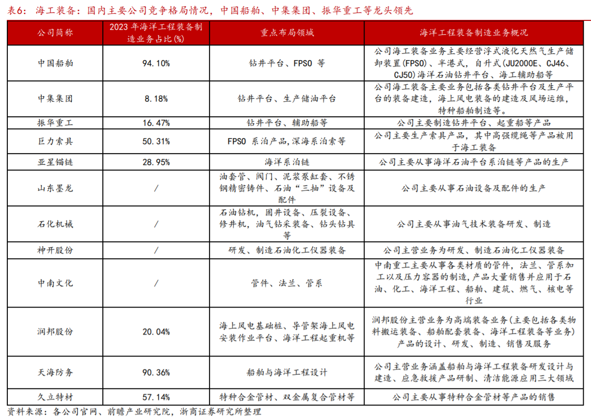 3)第三梯队:主要为中国、巴西等公司,大多处于制造中的低端产品,开始进入到高端产品集成领域。中国船舶、中集集团、振华重工等布局了钻井平台、生产储油平台等具有较高的技术价值的产品,巨力索具、亚星锚链等专注于核心配套装备领域。