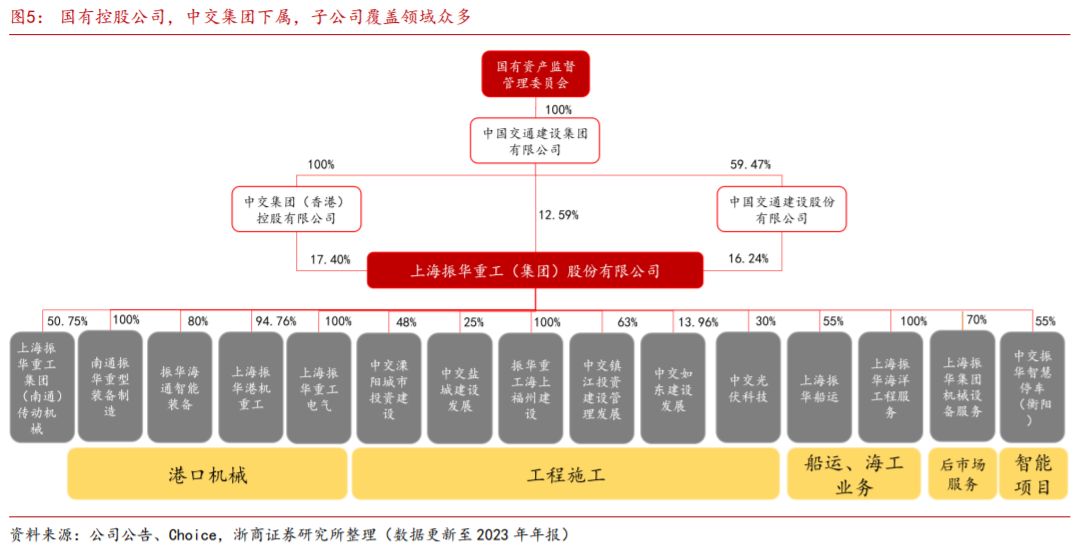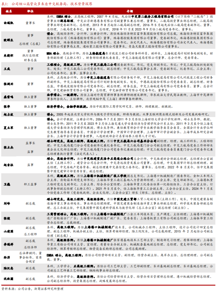 中交集团为公司控股股东持股比例为46%,实际控制人为国务院国资委。董事长由瑞凯为正高级工程师,曾任中交第二航务工程局重要职务,众多高管来自中交航务工程局和上海港口机械制造厂,专业实力深厚。