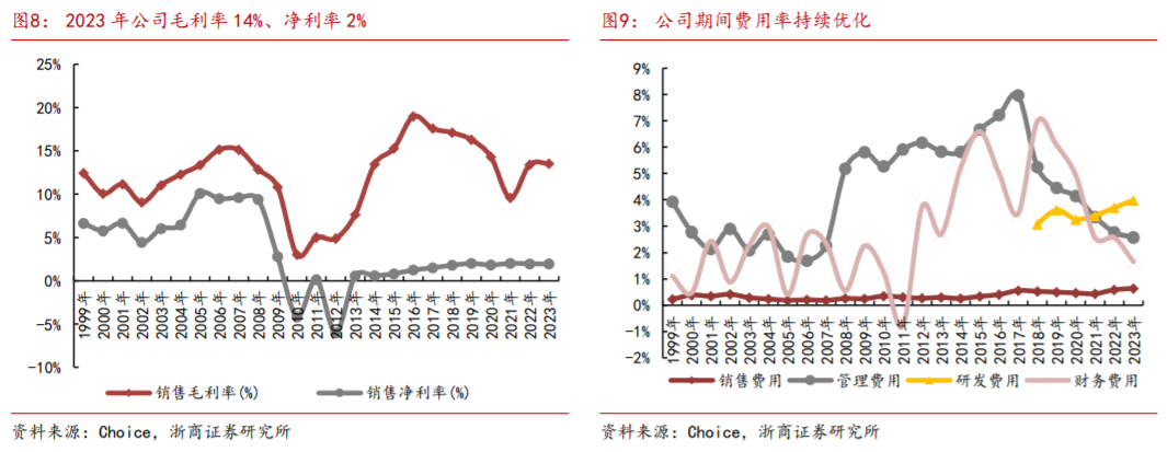 期间费用持续优化,过去5年持续保持下降趋势。从2018年的16%,降低至2023年的9%。核心受益于公司管理费用和财务费用的持续优化。