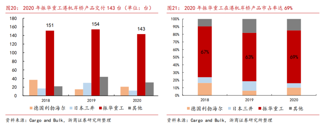 1)港口机械行业:公司岸桥产品全球市占率70%,连续26年保持世界第一,订单签约率保持行业龙头地位,拥有厦门港、宁波港、北部湾、美国长滩港等海内外重要港口客户的港机项目订单。公司作为港机行业龙头,受益港口升级改造建设、自动化码头建设带来的市场红利,进一步巩固市场份额。