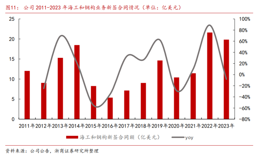 2) 海工装备:2022 年中国海工装备制造企业营收达 740 亿元,同比增长 19.7%。公司具备海洋工程 EPCI 总承包能力,可自主设计并建造多种高端海工装备。公司海工装备订单从 2018 年的 5.83 亿美元增长至 2023 年的 15.14 亿美元,2018-2023 年订单金额CAGR=21%,保持了稳中有进的发展态势。未来有望受益于油价提升、风电需求提升,持续驱动公司业务发展。