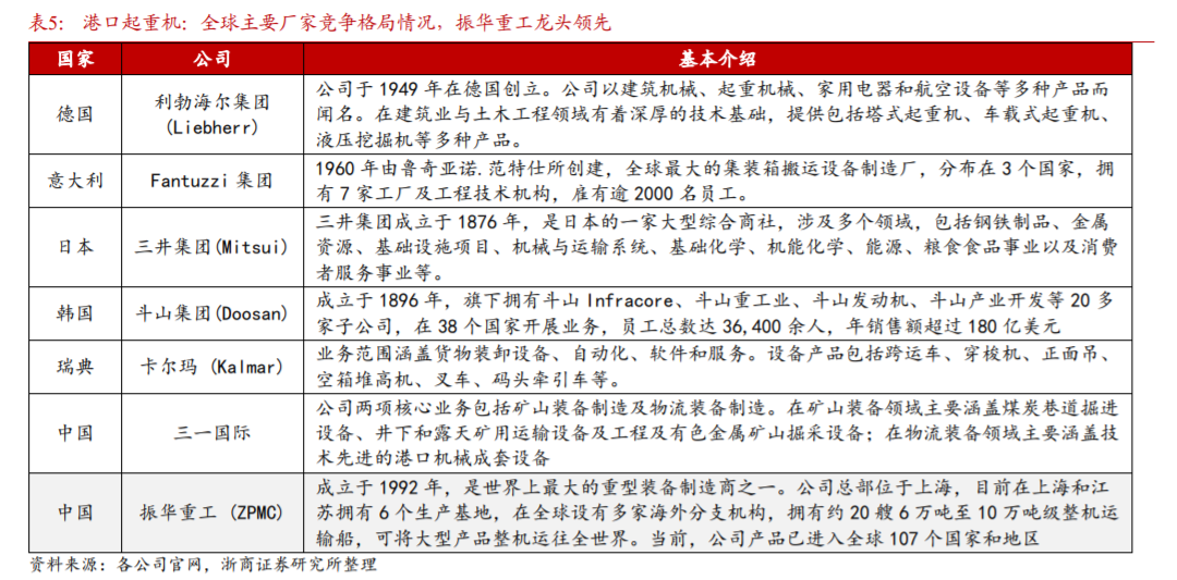 2)竞争格局集中:大型港口起重机——振华重工为世界龙头,其他行业参与者主要为大型综合性工程机械制造商,包括:德国利勃海尔集团、意大利Fantuzzi、日本三井制造、韩国斗山工程机械、瑞典卡尔玛、三一国际等。小型港口起重机——产品种类较多,行业公司相对大港机更加多元,三一国际在集装箱正面吊和堆高机市场占据龙头地位。竞争格局趋势——港机行业门槛较高、下游港口客户集中度高,预计未来竞争格局将持续保持较为集中态势。