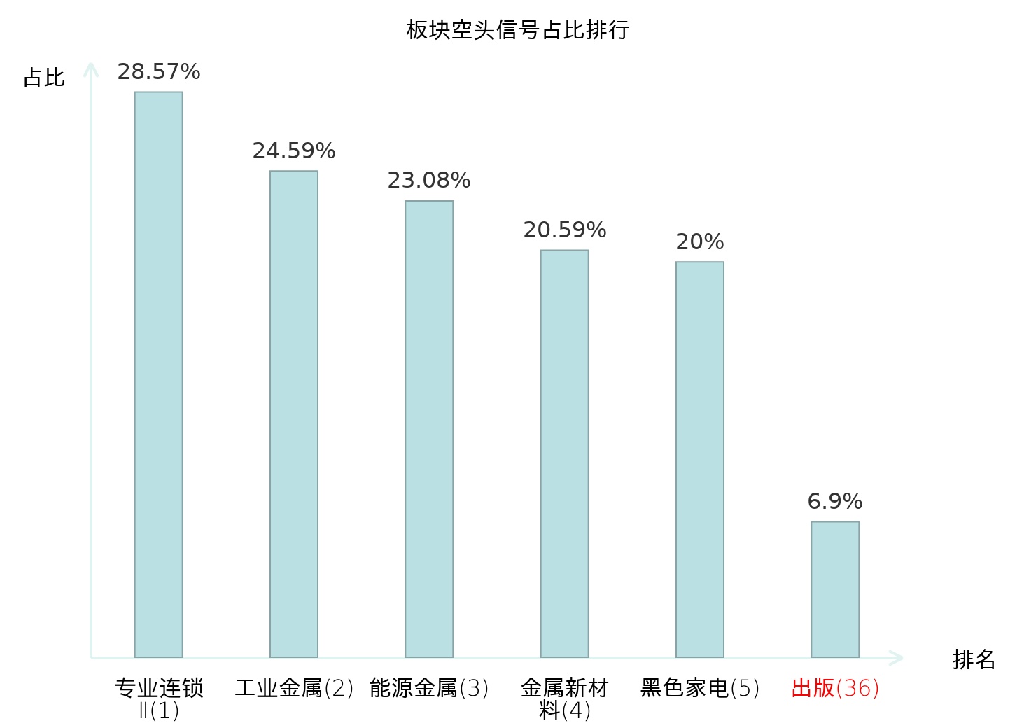 全市场所有行业板块中主力空头信号占比排名中,专业连锁Ⅱ板块位居第一。装修建材板块名次提升最快,较昨日上升120位。