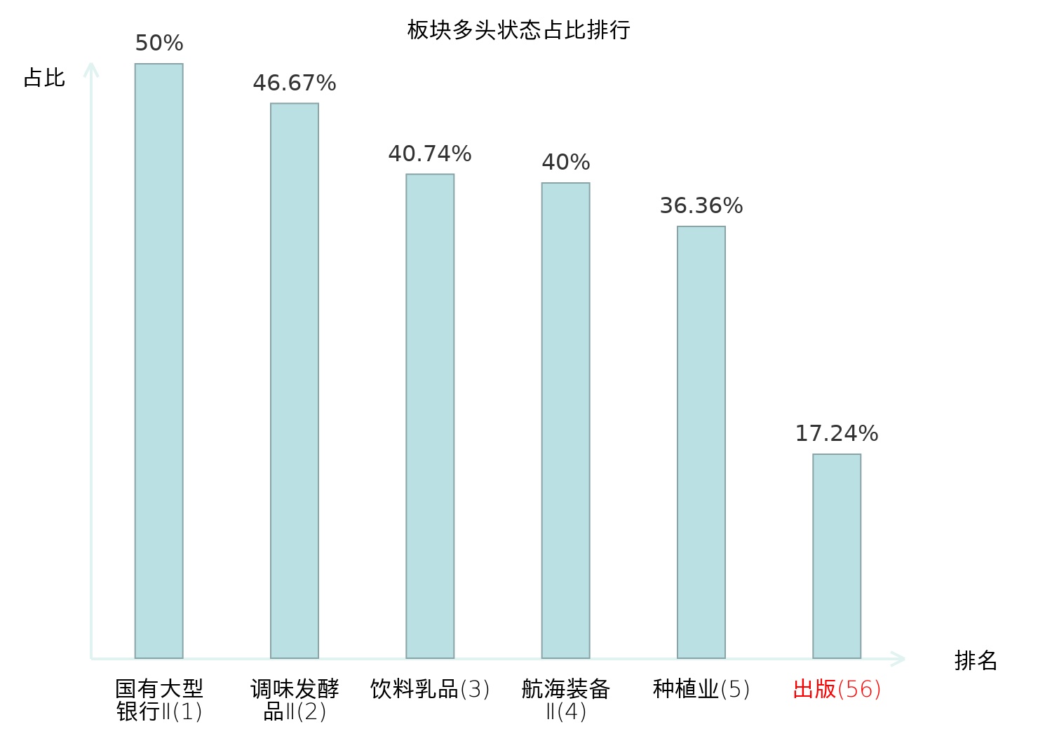 全市场所有行业板块中主力多头状态占比排名中,国有大型银行Ⅱ板块位居第一。金属新材料板块名次提升最快,较昨日上升71位。