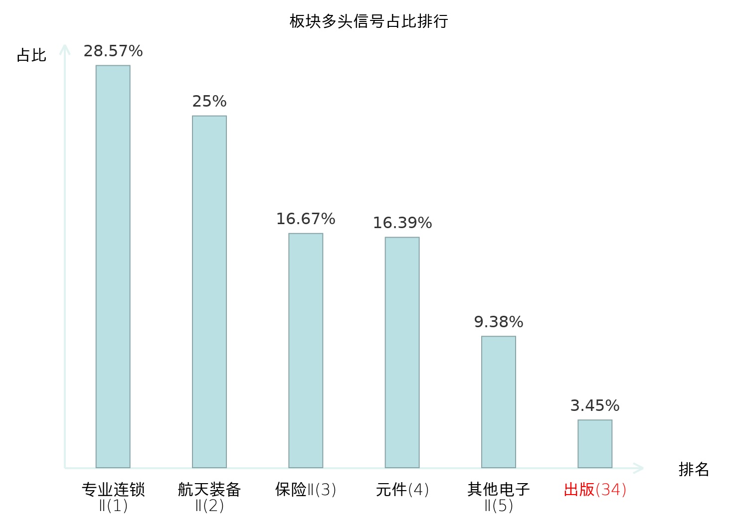 全市场所有行业板块中主力多头信号占比排名中,专业连锁Ⅱ板块位居第一。保险Ⅱ板块名次提升最快,较昨日上升121位。