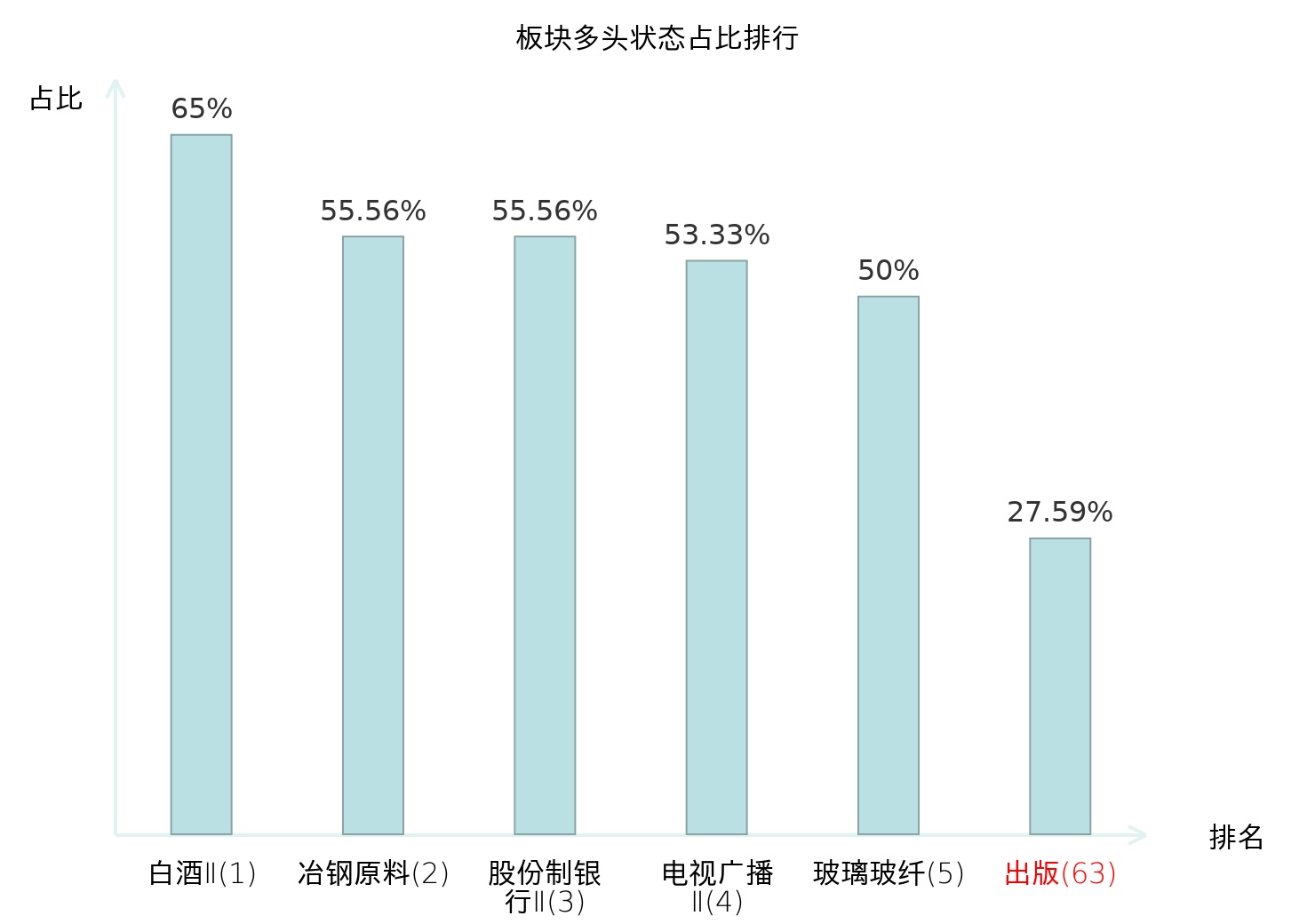全市场所有行业板块中主力多头状态占比排名中,白酒Ⅱ板块位居第一。白酒Ⅱ板块名次提升最快,较昨日上升71位。