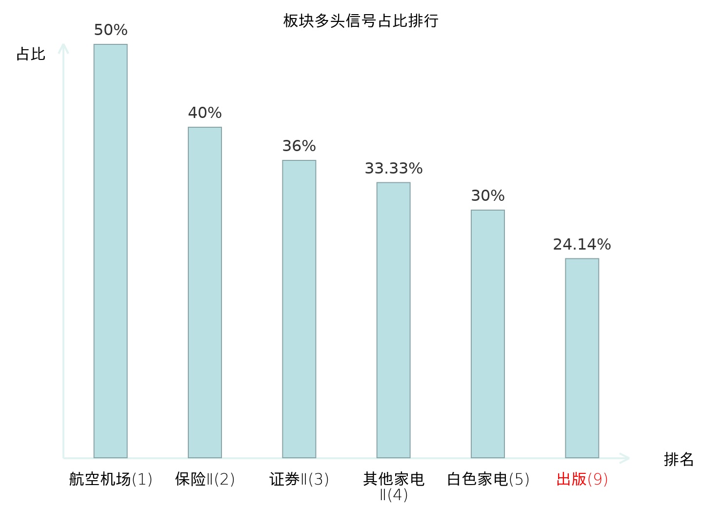 全市场所有行业板块中主力多头信号占比排名中,航空机场板块位居第一。其他家电Ⅱ板块名次提升最快,较昨日上升126位。