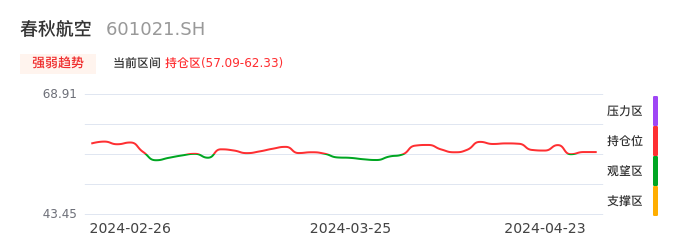 我们来看一下该股的九方特色指标强弱趋势的情况:春秋航空近日从观望区上穿到持仓区。股价短期站稳多头区域,上升动能仍较为充足,可积极关注。后续重点关注上方压力位:62.33元是否能突破上攻。
