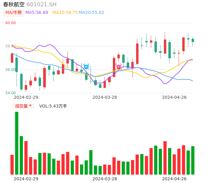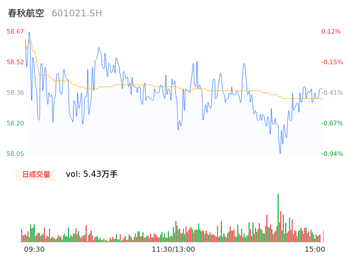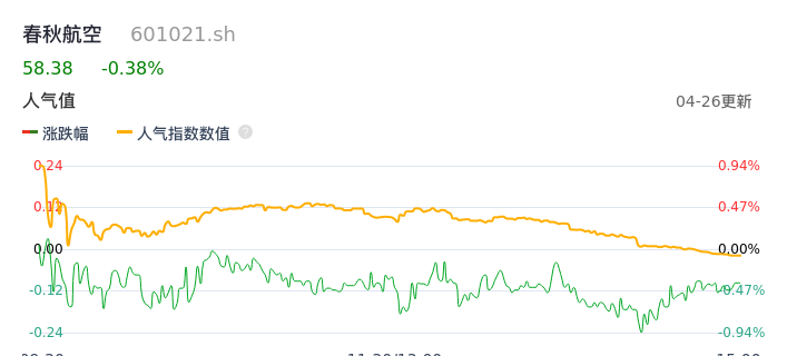 04月26日,春秋航空收报58.38,股价涨幅-0.38%,成交金额3.17亿元,换手率0.55%。