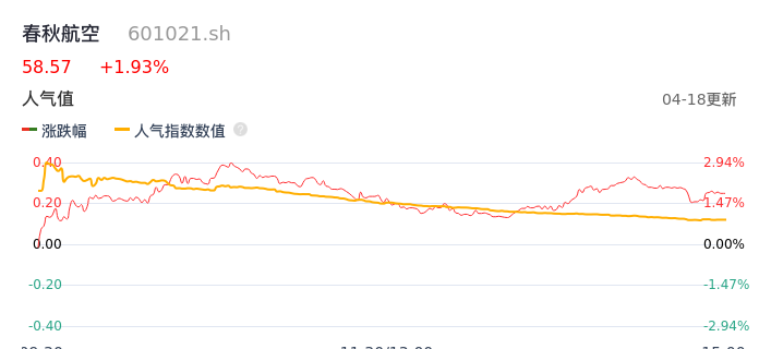 04月18日,春秋航空收报58.57,股价涨幅1.93%,成交金额3.72亿元,换手率0.65%。