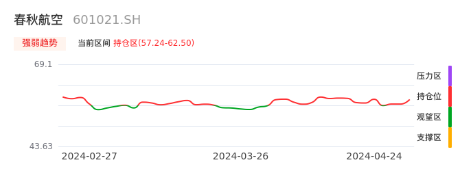 我们来看一下该股的九方特色指标强弱趋势的情况:春秋航空近日从观望区上穿到持仓区。股价短期站稳多头区域,上升动能仍较为充足,可积极关注。后续重点关注上方压力位:62.50元是否能突破上攻。
