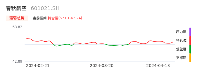 我们来看一下该股的九方特色指标强弱趋势的情况:春秋航空自04月01日从观望区上穿到持仓区。股价近期在多头区域持续强势上扬,上升动能仍较为充足,可积极关注。后续重点关注上方压力位:62.24元是否能突破上攻。