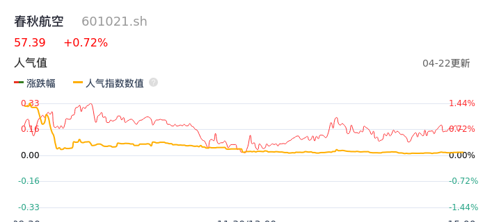 04月22日,春秋航空收报57.39,股价涨幅0.72%,成交金额2.21亿元,换手率0.39%。