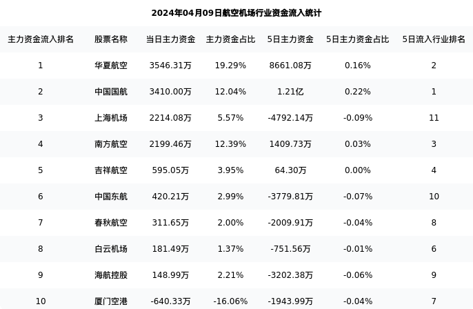 从主力资金流向来看,航空机场行业今日主力资金流入9.26亿元,在所有申万二级行业中排名:91/131。
