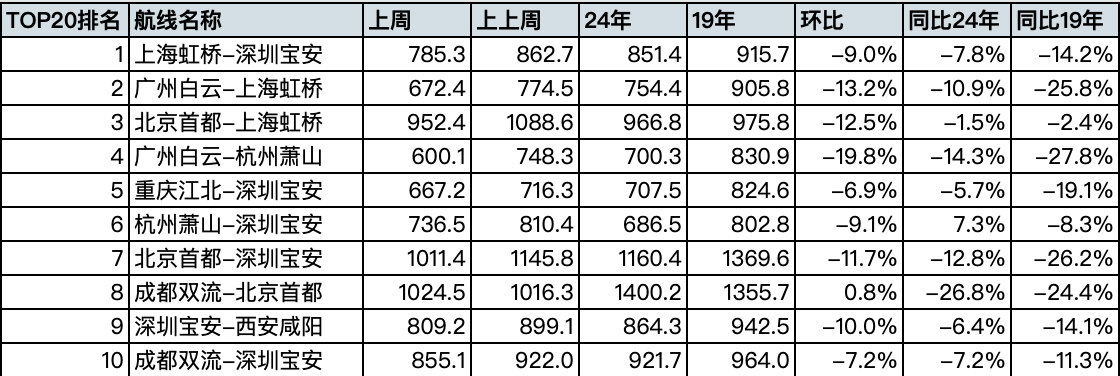 来自航班管家的统计显示,上周国内航班量排名前20的航线票价,均比上上周下滑,最多下降超过两成,而上周的票价相比2024年同期也是下滑的态势,同比疫情前的2019年同期下滑幅度更大。而一些旅游航线的降幅更大,部分不含税票价比高铁二等座还要便宜。