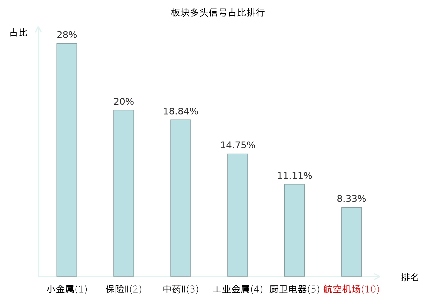 全市场所有行业板块中主力多头信号占比排名中,小金属板块位居第一。保险Ⅱ板块名次提升最快,较昨日上升123位。