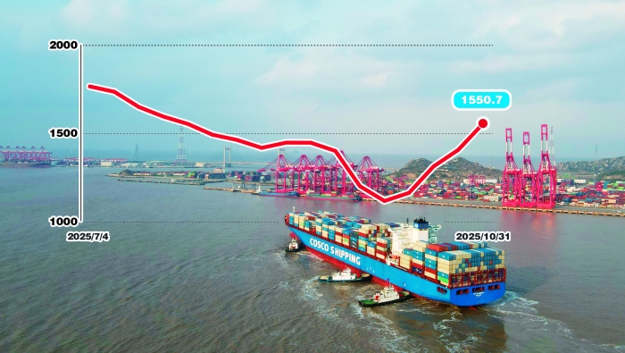 上海航运交易所10月31日发布的数据显示,上海出口集装箱综合运价指数为1550.70点,较上期上涨10.5%,较9月26日的相对低位上涨近40%。上海港出口至美西和美东基本港市场运价分别上涨22.9%、13.4%,较9月26日的相对低位分别上涨81.30%和44.15%。