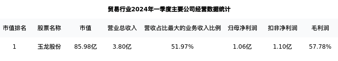 玉龙股份最新报告期数据为一季度,下表汇总了贸易行业内市值靠前的公司一季度主要经营数据