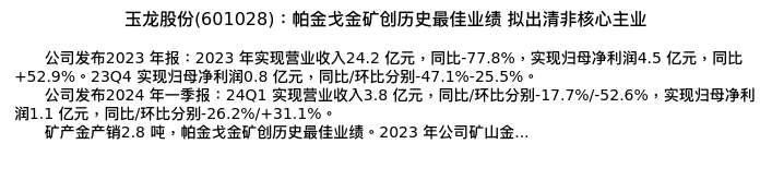 值得注意的是:2024年04月招商证券的刘文平/赖如川分析师,首次发布关于玉龙股份的研究报告,标题为:玉龙股份(601028):帕金戈金矿创历史最佳业绩 拟出清非核心主业。