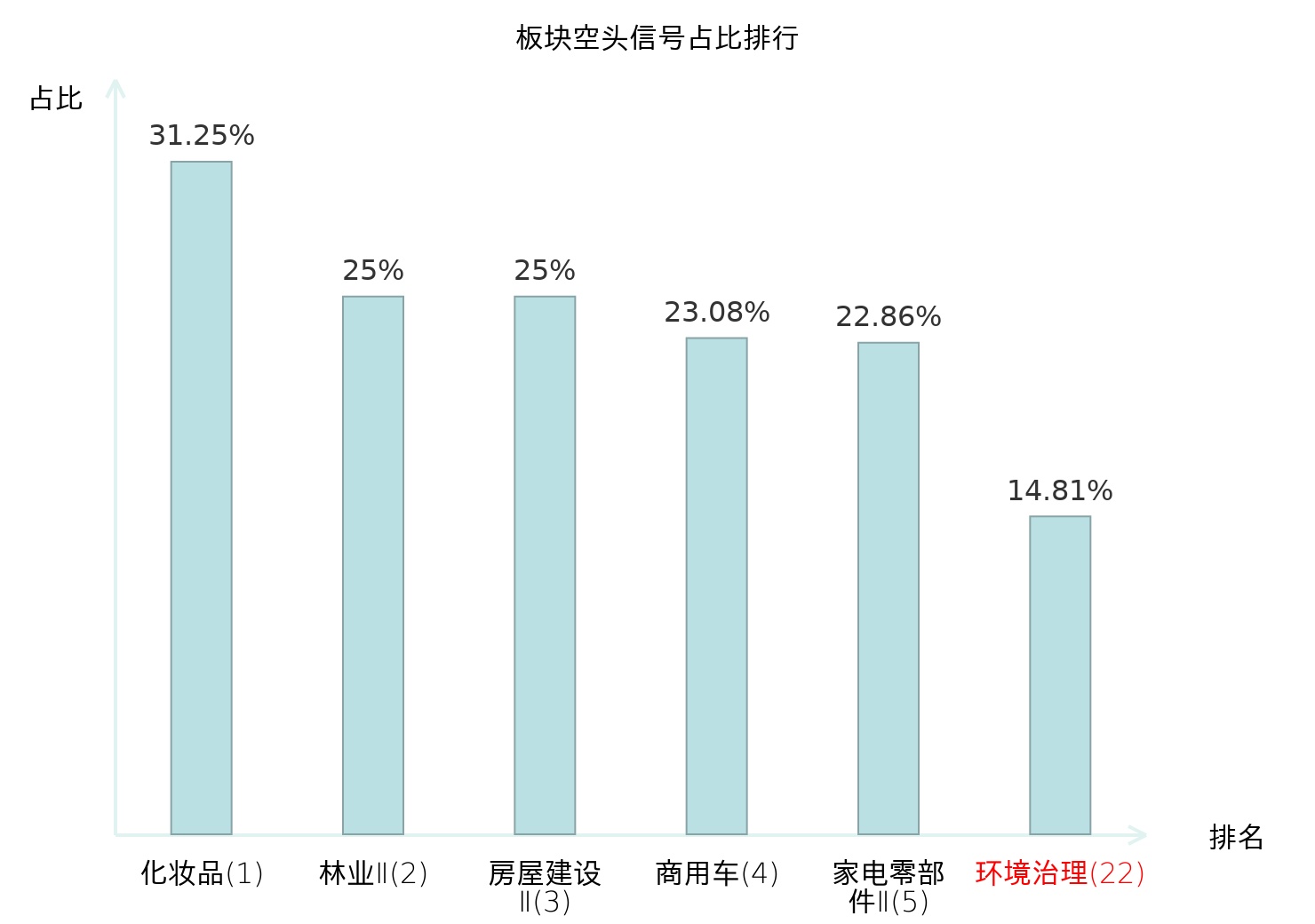 全市场所有行业板块中主力空头信号占比排名中,化妆品板块位居第一。房屋建设Ⅱ板块名次提升最快,较昨日上升113位。