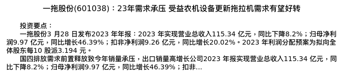 值得注意的是:2024年04月中原证券的刘智分析师,首次发布关于一拖股份的研究报告,标题为:一拖股份(601038):23年需求承压 受益农机设备更新拖拉机需求有望好转。