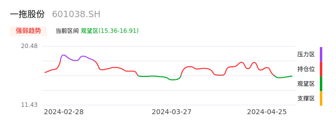 我们来看一下该股的九方特色指标强弱趋势的情况:一拖股份近日从持仓区下穿到观望区,股价出现持续调整。短期出现止跌态势,后续重点关注能否再次站上多空分界点:16.91元。如未能有效突破则可能进入新一轮空头行情。
