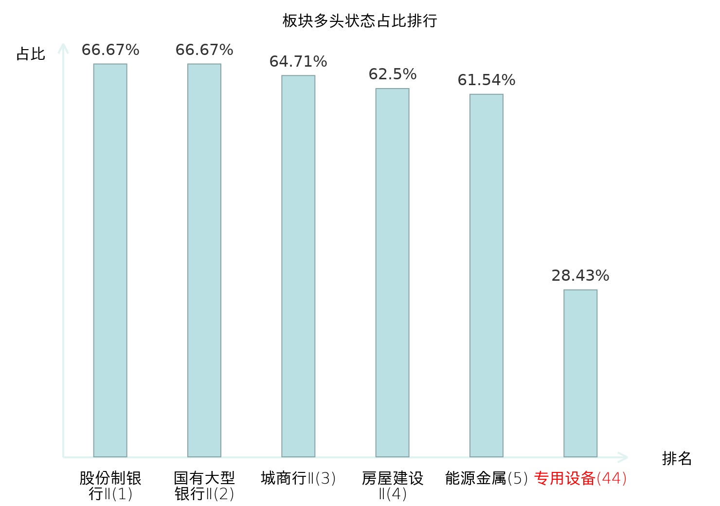 全市场所有行业板块中主力多头状态占比排名中,股份制银行Ⅱ板块位居第一。其他家电Ⅱ板块名次提升最快,较昨日上升102位。