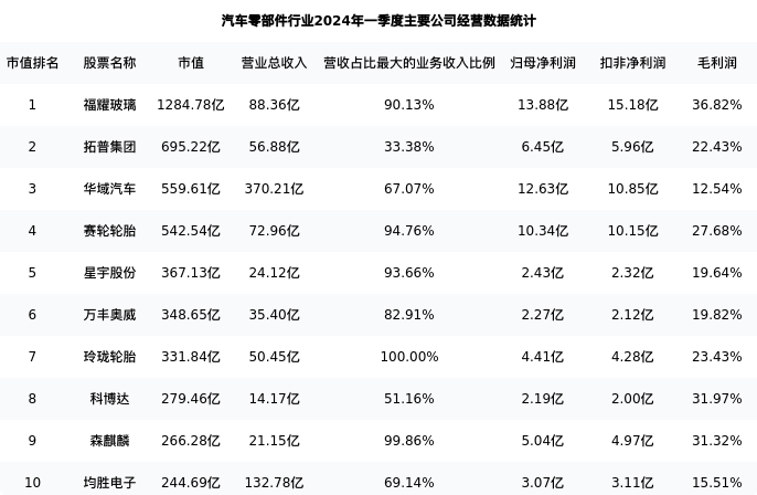赛轮轮胎最新报告期数据为一季度,下表汇总了汽车零部件行业内市值靠前的公司一季度主要经营数据