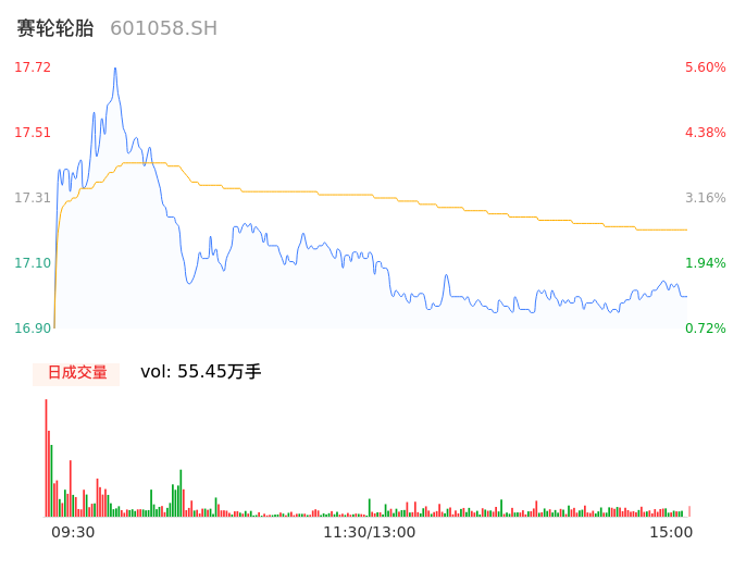 04月19日,赛轮轮胎收报17.06,股价涨幅1.67%,成交金额9.54亿元,换手率1.69%。