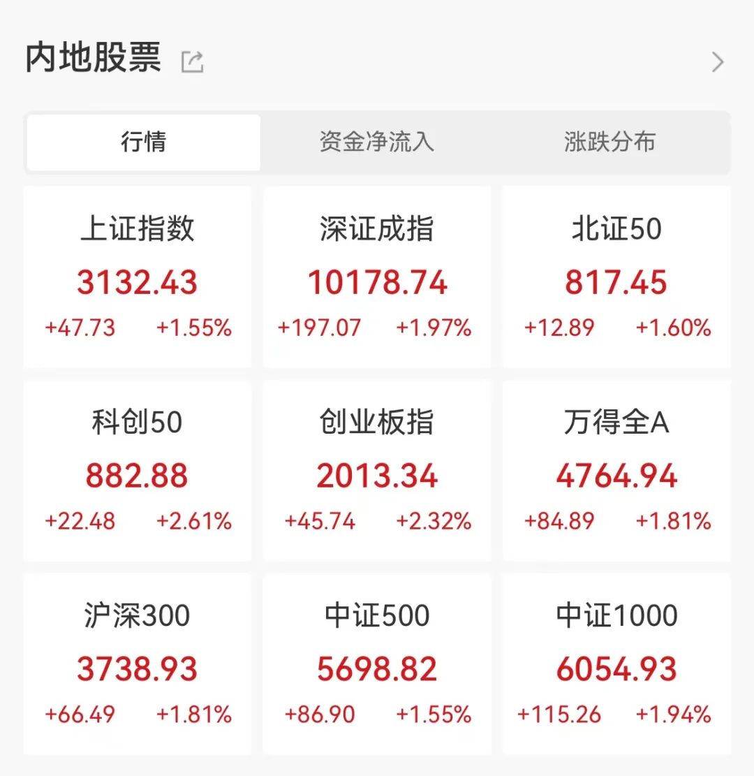 9月22日,A股三大指数放量反弹。沪指收涨1.55%,重返3100点上方,报3132.43点;深证成指收涨1.97%,创业板指收涨2.32%。