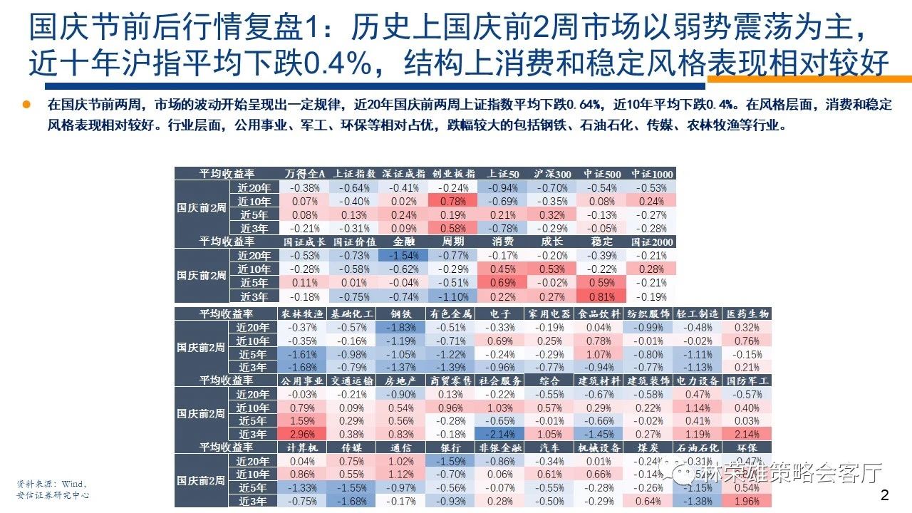 安信证券林荣雄在9月14日发布的研报中复盘近二十年来国庆假期前后A股市场的表现规律。在国庆节前夕,市场的波动就开始呈现出一定规律,近20年国庆前两周上证指数平均下跌0.64%,近10年平均下跌0.4%。在风格层面,消费和稳定风格表现相对较好,整体偏向防御。从收益率来看,国庆节前5个交易日出现普跌,节后5个交易日反弹上涨明显。