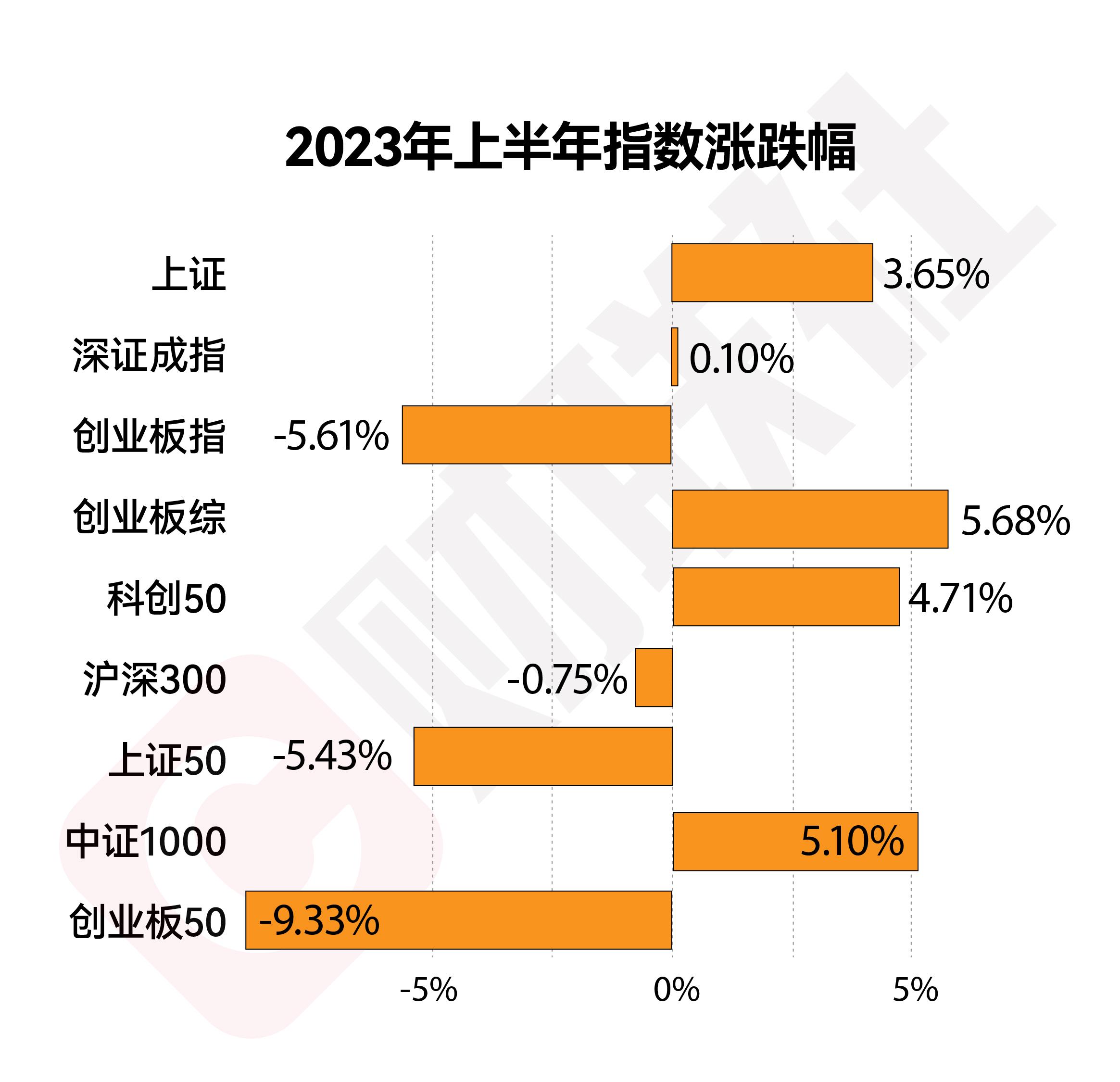 从指数表现来看,2023年上半年,上证指数收于3202.06点,上半年涨幅3.65%,最低3073.05点,最高3418.95点;深证成指收于11026.59点,上涨0.10%,最低10648.14点,最高12246.01点;创业板指收于2215.00点,下跌5.61%,最低2118.33点,最高2661.28点。