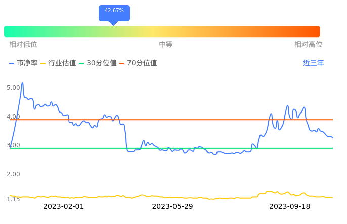 信达证券当前市净率PB为3.25,在所属的证券中,市净率PB排46,前五名分别为海通证券市净率0.79、国元证券市净率0.89、国泰君安市净率0.92、华创云信市净率0.95、华西证券市净率0.96。信达证券当前市净率PB为3.24,超过近3年42.67%的历史数据。