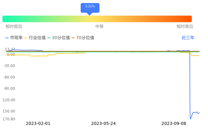 信达证券当前市现率为-153.09,在所属的证券中,市现率排23,前5名分别为、申万宏源市现率1.81、兴业证券市现率2.67、东北证券市现率3.43、广发证券市现率3.83、国泰君安市现率4.63。信达证券当前市现率为-153.09,超过近3年3.31%的历史数据。