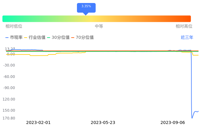 信达证券当前市现率为-151.76,在所属的证券中,市现率排23,前5名分别为、申万宏源市现率1.82、兴业证券市现率2.67、东北证券市现率3.41、广发证券市现率3.86、国泰君安市现率4.62。信达证券当前市现率为-151.76,超过近3年3.35%的历史数据。