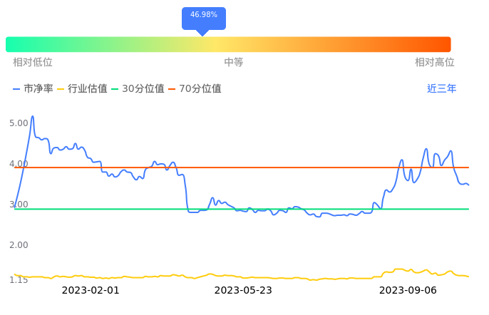 信达证券当前市净率PB为3.58,在所属的证券中,市净率PB排46,前五名分别为海通证券市净率0.77、华创云信市净率0.83、国元证券市净率0.89、国泰君安市净率0.91、华西证券市净率0.97。信达证券当前市净率PB为3.58,超过近3年46.98%的历史数据。