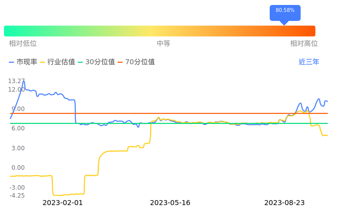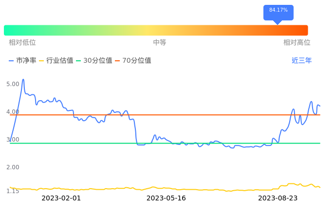 信达证券当前市净率PB为4.24,在所属的证券中,市净率PB排48,前五名分别为海通证券市净率0.80、华创云信市净率0.85、国元证券市净率0.91、国泰君安市净率0.95、华西证券市净率1.02。信达证券当前市净率PB为4.20,超过近3年84.17%的历史数据。